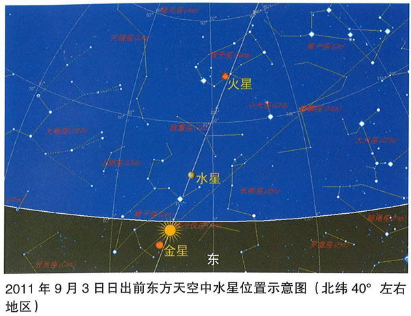 本次大距水星与太阳的角距离约为18°,由于水星赤纬比太阳高,因此对于北半球来说观测条件较好。以北纬40°左右地区为例,9月3日日出时水星的地平高度已有16°,亮度约-0.2等,之前的半小时左右是较住的观测时机。其实,本次大距前后几天水星的观测条件也都不错,只要赶上晴天,大家就可以起个大早,找个东方遮挡较少的地方,根据我们提供的示意星图来尝试寻找水星。