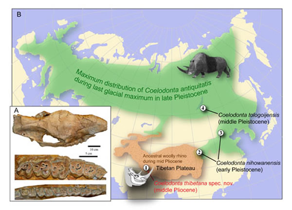 以中国科学院古脊椎动物与古人类研究所邓涛研究员为首的中外科学家在2011年9月2日出版的《科学》杂志上报道了在西藏喜马拉雅山西部高海拔的札达盆地发现的一个上新世哺乳动物化石组合,其中包含了已知最原始的披毛犀。冰期动物群长期以来已被认识到与更新世的全球变冷事件密切相关,其中的动物也表现出对寒冷环境的适应,如体型巨大,身披长毛,并具有能刮雪的身体构造,以猛犸象和披毛犀最具代表性。这些令人倍感兴趣的绝灭动物一直受到广泛的关注,它们的上述特点曾经被假定是随着第四纪冰盖扩张而进化出来的,即这些动物被推断可能起源于高纬度的北极圈地区,但一直没有可信的证据。邓涛等人根据来自西藏的新化石材料证明,冰期动物群的一些成员在第四纪之前已经在青藏高原上演化发展。冬季严寒的高海拔青藏高原成为冰期动物群的“训练基地”,使它们形成对冰期气候的预适应,此后成功地扩展到欧亚大陆北部的干冷草原地带。这一新的发现推翻了冰期动物起源于北极圈的假说,证明青藏高原才是它们最初的演化中心。