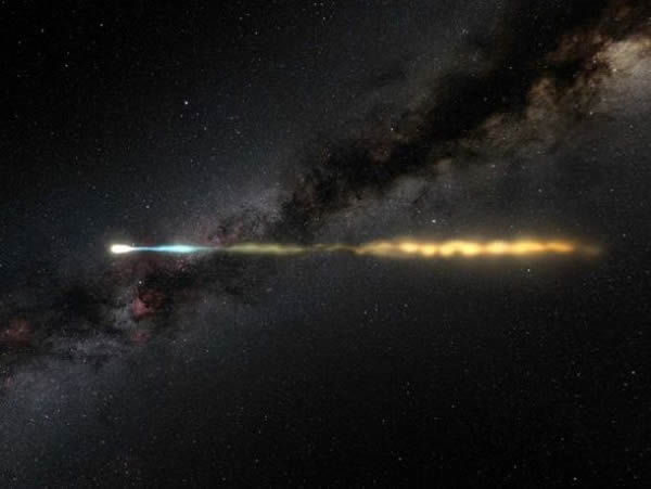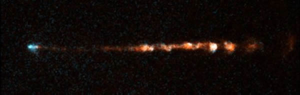 这幅图片来自于科学家利用哈勃照片制作的影像,HH 47推动明亮的弓形激波在太空中移动。HH 47喷流的长度是太阳系的10倍左右,由船帆座内的一颗年轻恒星产生。在视频中,这种喷流缓慢滑动,但实际上,它们是在高速移动,速度超过每小时44万英里(约合每小时70万公里)。延时影像显示,喷流中的气团以不同的速度移动,就像是高速公路上的车流。快速移动的气团超过速度较慢的气团,加热喷流内的物质,形成新的弓形激波。
