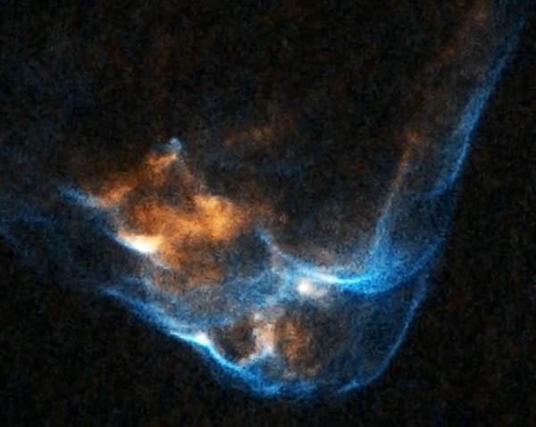 这幅图片来自一段新公布的利用哈勃照片制作的影像。随着HH 34喷流内的弓形激波发生相互作用,一些气团亮度增高,一些则趋于暗淡。这些影像显示喷流中的气团在新生恒星附近形成。具体到HH 34身上,哈蒂根和同事将一个发光的气团的源头追踪到距恒星不到90亿英里(约合145亿公里)的区域。
