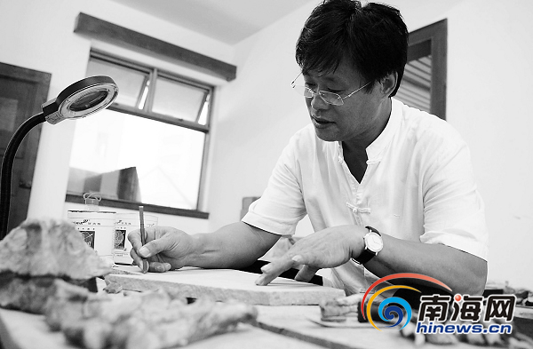 三亚自然博物馆馆长李跃卓正在进行化石修补