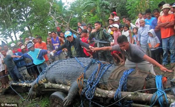 市长埃德温·艾洛德(Edwin Elorde)告诉记者说:“要跟这样的巨兽面对面对抗,我们都很紧张。但是我们别无选择,这条巨型鳄鱼正威胁着村民和他们的家畜。”他说:“当我们终于将这个庞然大物拖上岸时,我简直不敢相信自己的眼睛。这家伙体型惊人,几乎可以一口吞下三个成年人。”