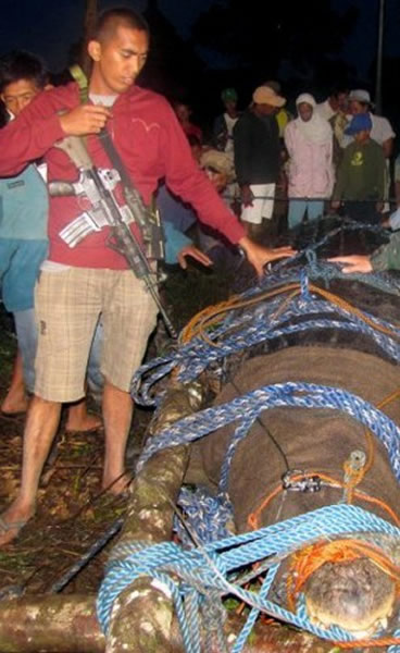 这次捕获的巨型鳄鱼位于菲律宾首都马尼拉东南部约500英里(约合805公里)的阿古桑(Agusan)市,这是一个贫困地区。尽管这里的居民一直处于这条巨鳄的威胁之下,但却没有人敢于站出来和它正面搏斗。终于,当一位村子里的渔民失踪,大鳄鱼成为首要怀疑对象之后,村民们决定采取行动。村民们开始展开细致的侦察活动,随后人们便发现了它的踪迹,当时它袭击了一头水牛。