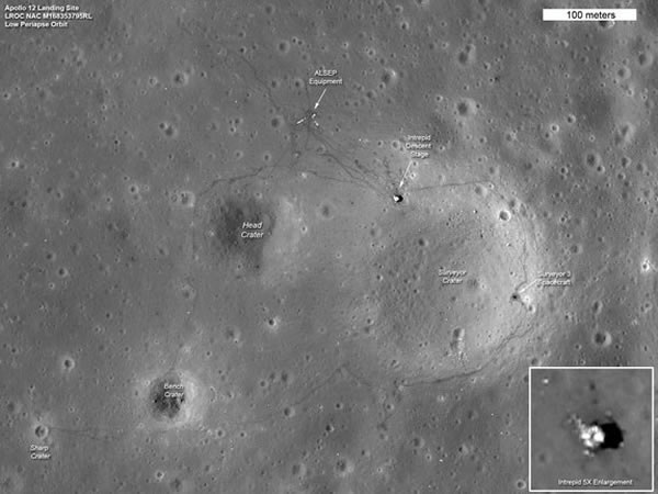 宇航员皮特·康拉德(Pete Conrad)和艾伦·宾(Alan Bean )于1969年在月球上留下的脚印,他们是在月球上行走的第三人和第四人。图的右下角是“阿波罗12号”的登月舱