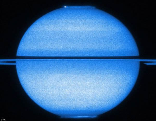 “卡西尼”号并不是唯一一艘拍摄到土星照片的飞船,这张照片是由哈勃太空望远镜拍摄的,显示的是北极光和南极光
