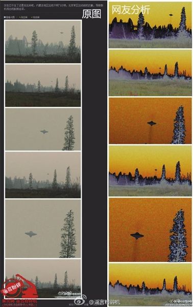 果壳网谣言粉碎机主题站微博发帖称,该组图片并非真实拍摄。帖子中称,在PhotoShop软件中调整该组照片曲线,可以看出“UFO”上下方区域有PS痕迹,所谓的“UFO”可能是水塔顶部或者路灯。