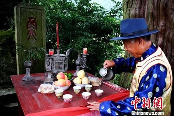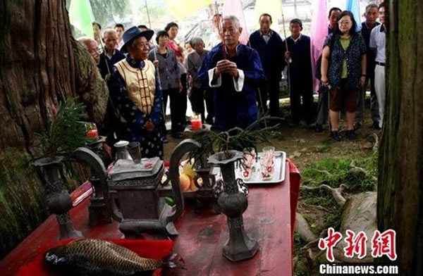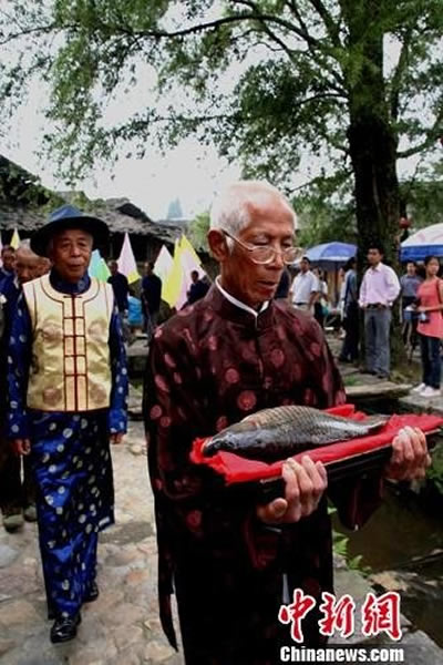 一位德高望重的老者,手托木盘,上面放置一只老死的鲤鱼,后面是一群神态肃穆的男女老少。他们神情凝重,伴随哀乐鼓锣声,缓缓护送老死的鲤鱼到千年鸳鸯柳杉下的冢墓前,点上三炷香,洒上一杯清酒,三拜九叩后,长者开始吟诵220多字的鱼祭文:时维公元二千十一年……人谙鱼性,鱼领人情,患难与共……奈何天不永年,遽尔云亡,人非草木,焉能忘情,衔悲忍痛,还招尔魂……燃放鞭炮后,鱼被放入鹅卵石垒砌的鱼冢中。整个仪式持续近20分钟,全场悲戚的情景丝毫不亚于为亡故亲人下葬。
