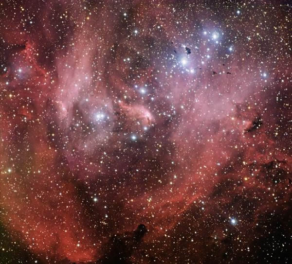 这片恒星“托儿所”位于半人马座,距离我们大约6500光年。这里展示的照片由欧洲南方天文台MPG/ESO 2.2米望远镜获取,该天文台设立于南美洲的智利。星云深处,丰富的氢气物质导致大量新生恒星的诞生,它们发出的强烈辐射照亮了星云。它们发出的紫外辐射让周围的氢原子电离,发出红色光芒。