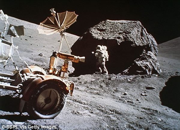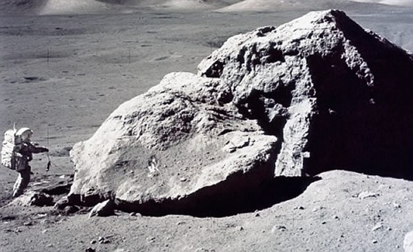 从这张照片上可以看到,施密特正在一块巨石旁收集月球岩石样本,月球车的部分出现在他前面的画面上