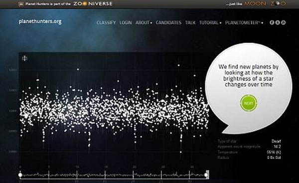 普通人通过一个网上项目——Planet Hunters,用自己的电脑就可以成为天文学家。通过该项目,利用来自NASA开普勒望远镜的数据,有人发现了两个新的行星,其中一个有地球的八倍大。尽管这两个行星需要做进一步的确认观察,但是研究人员称,这一最新发现很可能是真实的。耶鲁大学的天文学家黛布拉·菲舍尔说:“这是第一次普通公众利用美国宇航局的数据发现卫星。”