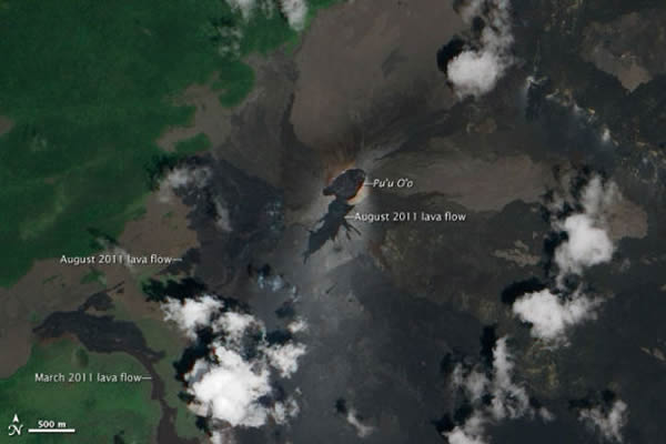 在夏威夷,今年也是一个火山多发期。2011年3月份,卡莫亚摩亚火山和普雾奥欧火山流出新的熔岩。在这幅于2011年9月中旬拍摄的卫星图片中,可以看到普雾奥欧火山流出的新熔岩。