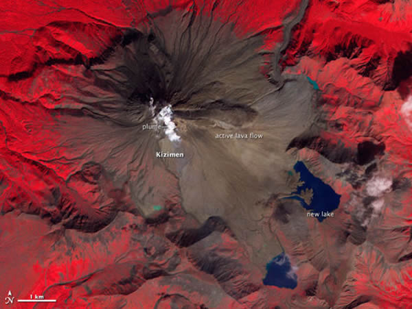 在俄罗斯堪察加半岛,过去几周内最活跃的火山当属基齐门火山。在这幅拍摄于9月底的伪色图中,可以清晰看到火山东侧的活动熔岩。