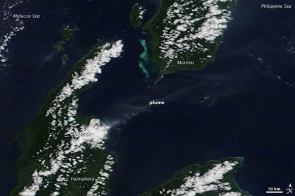 在印尼,每周的火山活动都相当丰富,最近的火山活动是里沃托比火山喷发。不过,本图显示的是哈马黑拉岛上的杜科诺火山上空稀薄的气体羽状物。