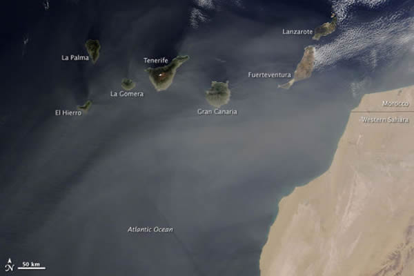 本图拍摄于2010年2月,显示的是加那利群岛。埃尔-耶罗岛位于群岛的最西端,是这个火山群岛中最年轻的火山岛,由此可见加那利群岛火山热区分布的范围有多宽。来自非洲的尘埃羽状物弥漫于加那利群岛的上空。近期,埃尔-耶罗岛发生地震和火山活动,当地居民被迫暂时撤离家园。