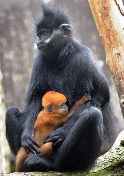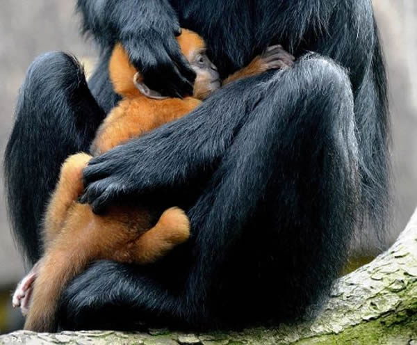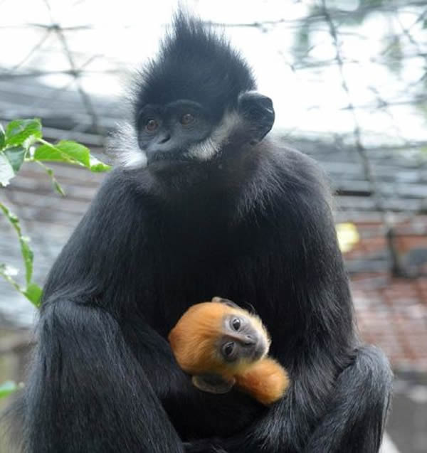 第一次做妈妈的“露露”(一只罕见的佛朗索瓦叶猴)与宝宝“坦戈”偎依在一起。“坦戈”是在伦敦动物园出生的,一身姜黄色毛发