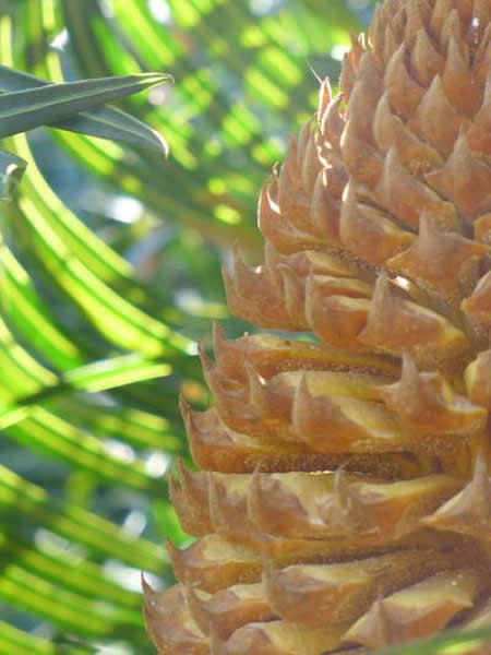 生长在悉尼皇家植物园的一个光果苏铁植物的花粉锥和叶。