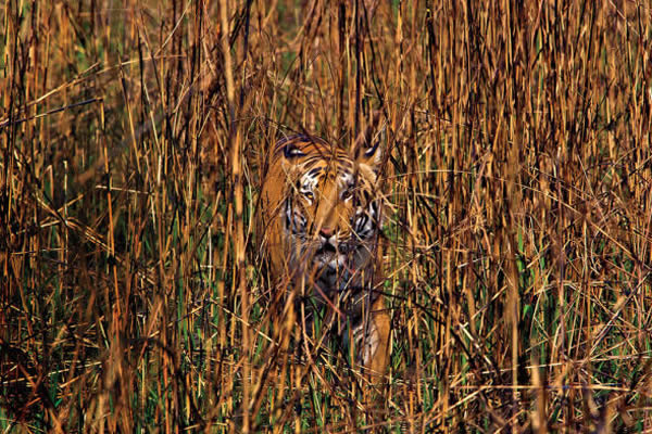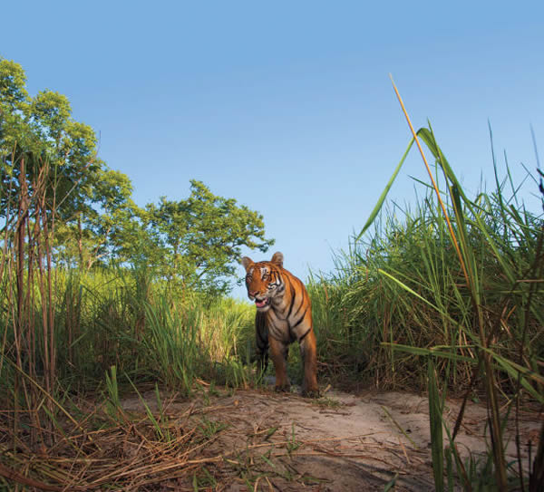 这是卡齐兰加国家公园内一部相机陷阱拍摄到的一只孟加拉虎。卡齐兰加国家公园是世界上孟加拉虎密度最大的地区,那里的独角犀牛的数量占全球现存独角犀牛总数的三分之二。