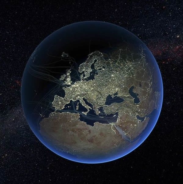 加拿大人类学家费里克斯-菲兰德绘制的地球图像,展现了大型公路、铁路网、输电线路和海底电缆。菲兰德通过将真实数据添加到夜晚拍摄的城市卫星照片上绘制出这幅图像
