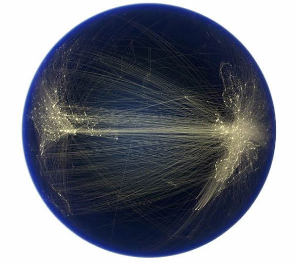 加拿大人类学家费里克斯-菲兰德利用13年时间绘制出一幅幅令人惊异的图像,展现数据同步传输电缆、飞机和公路等人类技术如何在地球表面“殖民”。图像中,大量金色线在暗淡的地球上延伸,形成一个生动的蜘蛛网,展现人类技术如何影响地球。