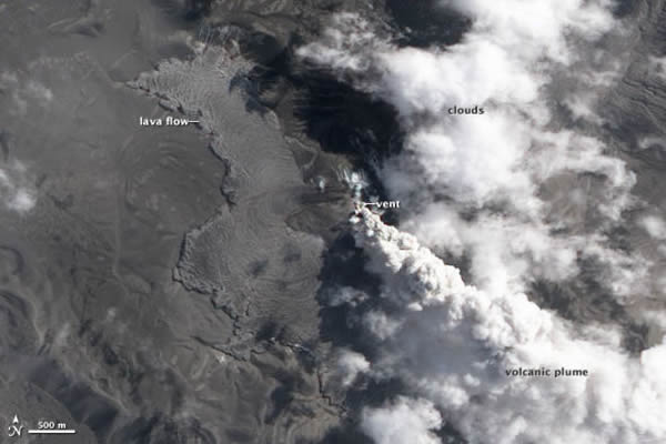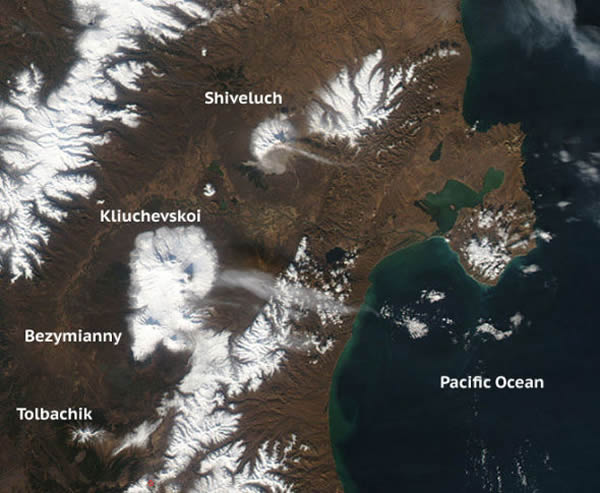 2011年10月16日,美国宇航局“地球观测卫星”从太空捕捉到俄罗斯堪察加半岛多座火山活动情况。这几座火山包括:什夫卢奇火山、图尔巴奇克火山、贝兹米亚尼火山和克柳切夫斯科伊火山。其中,什夫卢奇火山上空有一束纤细的火山灰羽状物正在向东方飘去。