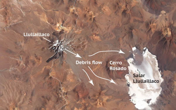 尤耶亚科火山位于智利与阿根廷边境,是一座巨大的复式火山,该火山上一次喷发活动发生于1877年。在尤耶亚科火山的北侧,有一条旧的熔岩流,这与智利普耶维-卡顿-考莱火山的新熔岩流有些相似。其实,尤耶亚科火山还有一个喷发特点与其他许多安第斯火山很相似,那就是岩屑崩落喷发。岩屑崩落沉积物正形成碎片流向尤耶亚科盐湖流去。图中箭头所指方向为巨大的岩屑崩落沉积物流流动的方向。