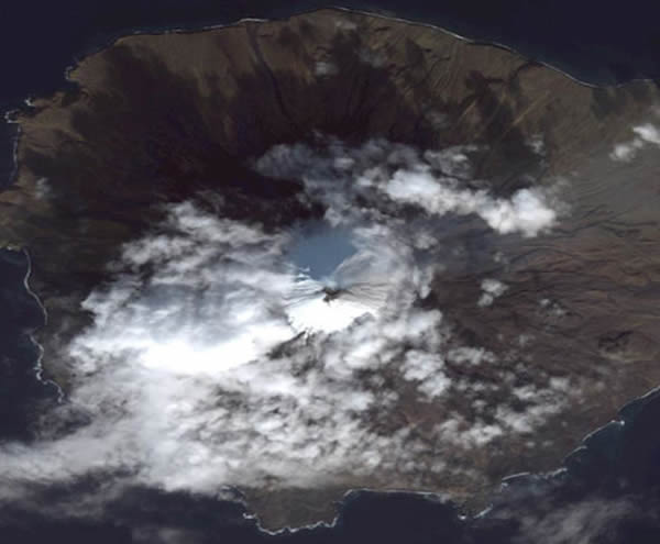 美国克利夫兰火山位于阿拉斯加阿留申群岛,是过去数月中最不平静的火山之一,一个新的圆顶正在火山锥顶部形成。最新一期火山活动报告称,这个圆顶正盖在火山口的边缘,但没有任何迹象表明圆顶会崩塌或有新的火山爆发活动。不过,这个圆顶一旦崩塌,就有可能是新一轮火山爆发的开始。在这幅卫星图片中,在火山的顶部可以看到一个小小的圆顶(灰色),一股稀薄的火山灰羽状物正在向东方飘去。