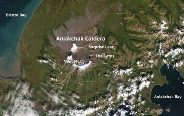 阿拉斯加阿尼亚查火山口大约形成于3400多年前的一次喷发活动中。那次喷发活动产生的火山灰流沉积物覆盖的范围远达50公里。在阿尼亚查火山口中,还有许多崩塌后的火山地形,如出口山脉,出口山脉是一个小型的火山渣锥。不过,与其他的火山坑湖泊不同的是,阿尼亚查火山口还有一个“大门”,火山坑中积聚的水可以由这个“大门”流出,因此阿尼亚查火山口中通常只会保留很少的水。近来,阿尼亚查火山相当平静,上一次爆发发生于1931年。