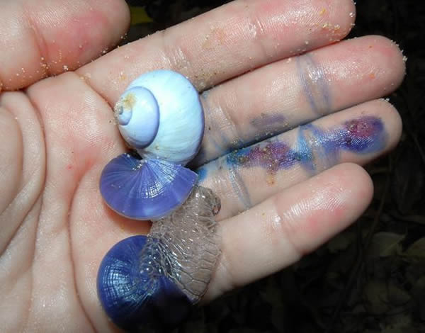 邱吉尔指出,紫罗兰色蜗牛可以分泌紫色染料,将人的手指弄脏,就像照片所展现的那样。这种染料可能帮助它们抵御捕食者。她说:“科学家并不十分清楚紫色染料的功能。在受到打扰时,气泡筏行蜗牛和梯螺都会分泌这种染料,可能是对干扰的一种反应。”美丽的气泡筏行蜗牛壳经常被冲上海滩。邱吉尔说:“在世界各地的几乎所有海滩,你都会发现这种美丽的蜗牛壳。”