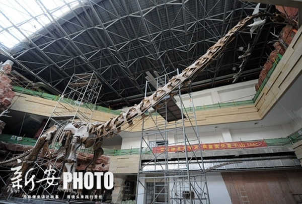 长达30多米的大夏巨龙骨骼模型已经安装成型