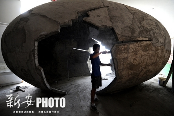 在省古生物化石博物馆内,一名工人正在组装一个恐龙蛋模型。