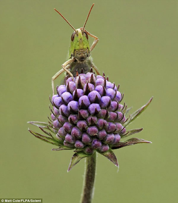 今年40岁的科勒生活在英国莱斯特郡劳恩特自然保护区,他说:“我非常喜欢拍摄动物或者昆虫不同寻常的模样,我对于这只蚱蜢所表现的奇特姿态非常感兴趣。当它从一处跳跃到一朵矮百合花朵顶部时我留心观察它几分钟时间。最后它栖息在这朵花上,我将照相机放置在三角架上成功地拍摄到它,当我正准备拍照时,这个小家伙面对镜头突然举起前腿,做滑稽的挠头模样。”