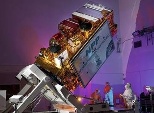 美国宇航局将发射NPP地球观测卫星,提升监测气候变迁的能力。图为加州范登堡空军基地的NASA工程师正在测试NPP卫星。