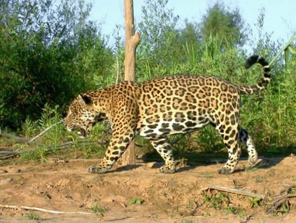 相机陷井拍到的一头玻利维亚美洲豹。马迪迪国家公园是玻利维亚最著名的旅游胜地之一,同时也是玻利维亚西北部和秘鲁东南部一个由6个国家保护区构成的保护链的组成部分。除了研究当地的生物多样性外,WCS也帮助马迪迪国家公园制定保护计划,保护地貌免遭一系列威胁侵袭,例如糟糕的开发规划。在建造公路、水力发电项目、森林采伐和发展农业过程中,玻利维亚缺乏合理的规划。