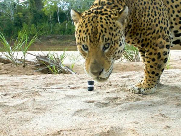 玻利维亚,一头美洲豹盯着WCS研究人员布置的相机陷井。他们在马迪迪和希斯河的源头附近布置陷阱,主要选在林间小道一带、河岸以及溪岸。与其他很多猫科动物不同,美洲豹是游泳健将,经常到河里捕猎鱼类、龟或者凯门鳄。在最近于玻利维亚进行的考察中,美洲豹共被拍到975次,创历史纪录。