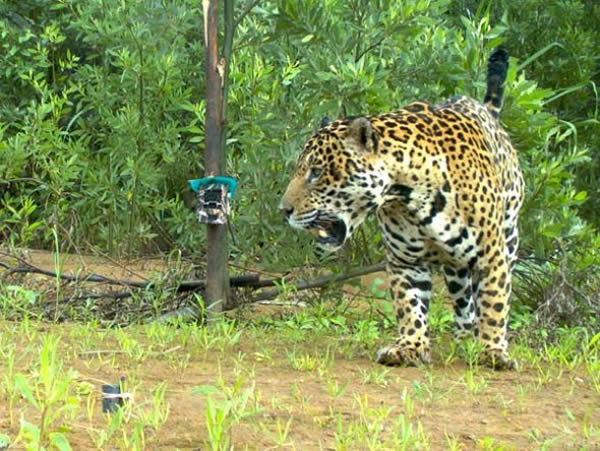 玻利维亚雨林,一头美洲豹被相机陷井“捕获”,两眼放光,看上去令人恐惧。美洲豹是美洲最大的本土猫科动物,被国际保护自然和自然资源联合会列为近危物种,面临着较高的野外灭绝风险。WCS将此次如此高的成功率归功于改用数码相机,而不是传统胶卷相机。数码相机让研究人员可以在短短几秒钟内获取照片,如果使用胶卷相机,冲洗照片则需等待几天时间。此外,数码相机能够存储大量照片,这也是胶卷相机无法做到的。