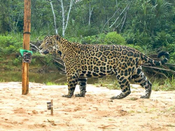 马迪迪国家公园相机陷井“捕获”的一头美洲豹。研究人员根据斑点图案确定美洲豹的身份。在美洲豹穿过红外光束时,相机陷井便被触发,拍摄下它们的影像。WCS的自然资源保护主义者罗伯特-华莱士在一份声明中说:“令我们感到兴奋的是,我们可以通过这些照片进一步了解这种难以捉摸的猫科动物以及它们在生态方面的需要。这些照片帮助我们了解个体美洲豹的生活,评估当地的美洲豹分布密度。”