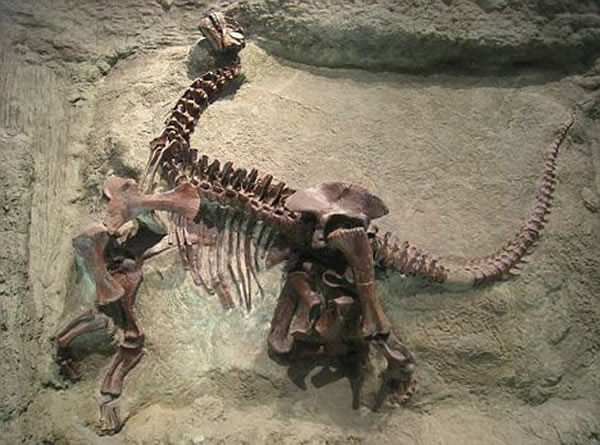 圆顶龙的骨架。美国科学家通过研究该恐龙牙齿化石中的氧同位素,证实这头巨兽在一年当中的不同时间在不同的地方饮水。