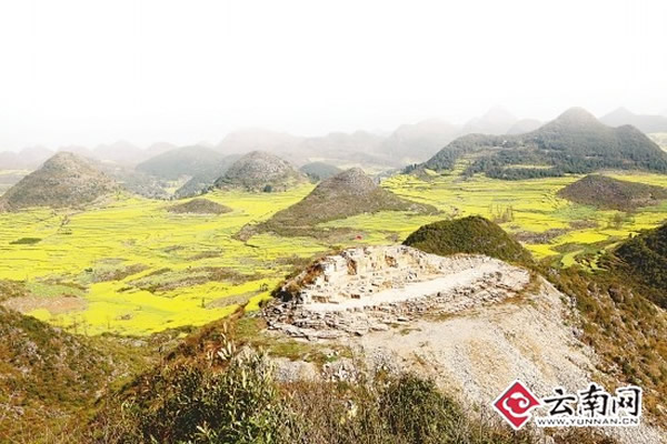站在采场上四目望去,苍翠的大地上一个个山峰次第隆起,这是罗平著名的“峰丛地貌”。“二三月份如果来这里,就能看到化石、油菜花、喀斯特地貌完美结合在一起的景色”,同行的古生物学家胡世学博士说。