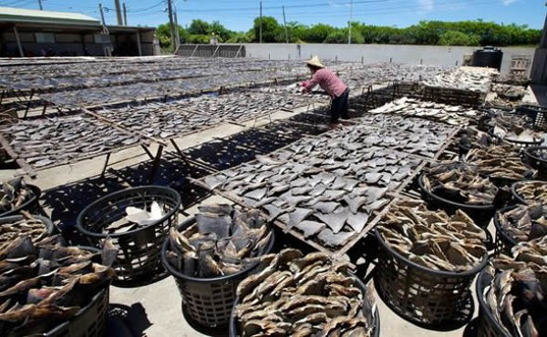 台湾的一家加工厂,一名工人正在晾晒鲨鱼鳍。台湾的鲨鱼鳍割取禁令将从2012年开始实施。按照这条禁令,渔民需要将整头鲨鱼带回渔港,不能割掉鱼鳍。TRAFFIC的桑特指出这项禁令能够限制最后被装上货船的鲨鱼数量。“作为五大捕捞鲨鱼的地区之一,台湾的禁令无疑是一项受欢迎的举措。”但皮尤环境组织的兰德表示:“鲨鱼鳍割取禁令并没有限制捕杀鲨鱼的数量,捕杀活动还将继续。”
