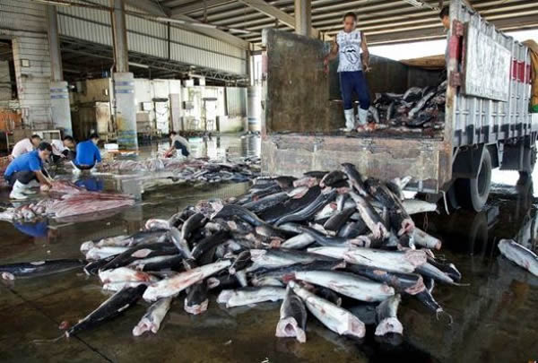 一堆鲨鱼尸体被卸到台湾的一个仓库。业内的人将鲨鱼尸体称之为“圆木”。TRAFFIC的乔伊斯-吴在邮件中表示,除了国际市场对鱼翅的需求外,台湾还存在一个大规模鲨鱼肉市场。一些鲨鱼尸体被运回来,而后加工成各种食品,但对于在遥远海域捕获的鲨鱼,由于缺少冷藏设施,鲨鱼鳍被割下来,身体则被抛到海里。这种做法令人担忧。乔伊斯指出,割掉鱼鳍后,台湾的大部分鲨鱼肉被加工成鱼酱和其他食品。