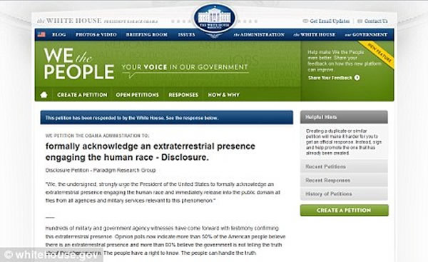 第二份请愿书有1.2万人签名,要求白宫承认外星人曾与人类接触。这份请愿书说:“数百个军方和政府部门的证词均证实地外生物存在。民意调查结果显示,有超过50%的美国人认为存在地外生物,有超过80%的人认为政府在这件事情上并没有说真话。人们有权知道真相。”