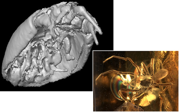 研究人员之前曾试图研究这只石化的螨虫,然而他们却无法透过琥珀清晰地展开观察。(在这张彩色图像中,它是位于蜘蛛背部中央的一个小肿块。)更糟糕的是,这只螨虫的下半段被蜘蛛遮挡住了。