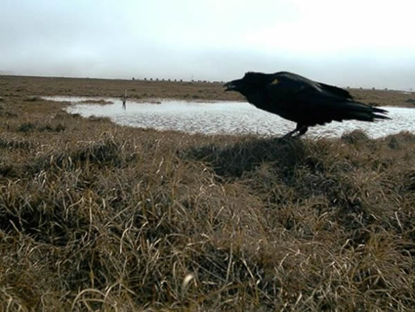 一只大乌鸦,正准备享用铁爪鹀的蛋。它用喙从铁爪鹀的巢穴将蛋偷走。大乌鸦是受益于阿拉斯加州能源基础设施的动物之一。利伯泽特说:“大乌鸦生活在北坡地区,它们需要一些垂直结构筑巢,但北极沿岸平原地区并没有树,因此可供它们筑巢的地方并不多。不过,它们能够利用人造结构,在高塔、建筑的屋檐或者其他结构上筑巢。在油田,它们的数量不断增多。毫不令人感到吃惊的是,它们同样以在油田筑巢的鸟的鸟蛋为食。”现在,大乌鸦一年四季在油田度过,但在过去,我们却极少在冬季时看到它们的身影。