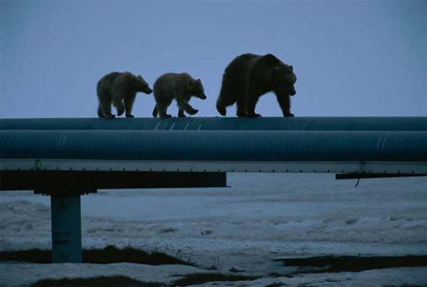 阿拉斯加普拉德霍湾,大灰熊妈妈和它的两个孩子在大垃圾箱中找吃的。这一景象说明普拉德霍湾周边的动物已经习惯于吃人类丢弃的垃圾。普拉德霍湾油田由英国石油公司、康菲石油公司和埃克森美孚公司运营。油田管理层采取了非常严格的措施,试图防止动物在垃圾中寻找食物,这些措施包括给大型垃圾箱安装盖子,同时提醒工人不要给熊或者狐狸等动物喂食。