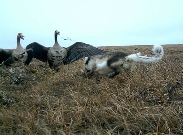 相机陷阱在阿拉斯加普拉德霍湾油田所在苔原地区拍摄的一幅生动照片,几只白额雁与一只突袭的北极狐展开较量,捍卫它们的巢穴。国际野生生物保护学会阿拉斯加北极地区研究计划的生物学家乔-利伯泽特表示:“相机陷阱拍摄的照片帮助我们进一步了解哪些捕食者突袭鸟类的巢穴,哪些捕食者没有上演这种行为。借助于相机陷阱,我们描绘出一幅更完整的图画,了解捕食者及其猎物的生活。”