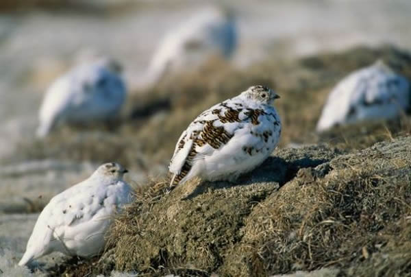阿拉斯加州普拉德霍湾,几只雷鸟站在石头上。雷鸟学名“Lagopus mutus”,一年四季生活在北极,羽毛从冬季的白色变成夏季的暗色。这种鸟生命力很强,能够经受住北极严酷环境的考验,在油田周围,它们的数量保持在一种“健康”状况,略少于每年夏季迁徙到北极繁衍后代的候鸟,后者的数量多达数百万只。