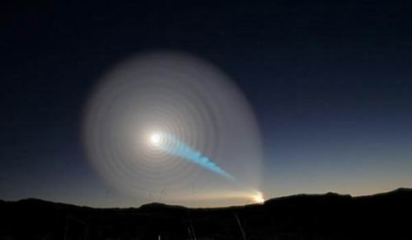 从另一个角度观看,它更像天空中出现的“虫洞”。但真实的情况却是俄罗斯军方导弹测试,据俄罗斯国防部称,当时在天空中形成的这一景象是由于此次导弹发射失败形成的奇特光线。这颗俄罗斯“布拉瓦”弹道测试弹发射之后,便呈螺旋状失去控制,并在空中形成神秘的螺旋效应。