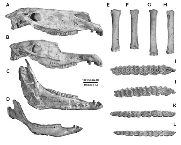 下层(A,C,E,G,I,K)与上层(B,D,F,H,J,L)埃氏马化石的头骨(A,B),下颌(C,D),第三掌骨(E,F),第三蹠骨(G,H),上颊齿列(I,J)与下颊齿列(K,L)(王世骐供图)