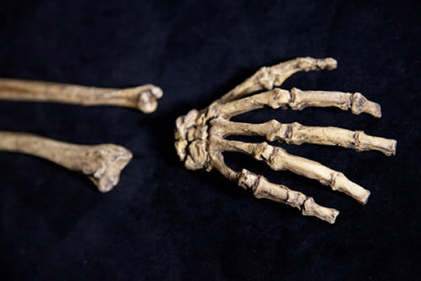 据英国新科学家杂志报道,当人们看到这两具骨骼远古骨骼时,会被它们的神秘性所吸引,保存完好的手掌骨骼与人类祖先的手骨骼非常接近。放置在黑色地毯上的骨骼脆弱且纤长,可详细地看到手掌骨骼关节。这是近期科学家在南非发现的两具190多万年前人类祖先——南方古猿的尸骸,甚至在骨骼上还残留着木乃伊化的皮肤,有望进一步揭晓人类进化之谜。