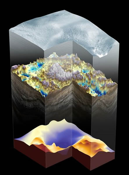由地球物理学家组成的国际小组近日从甘布尔泽夫山脉上空飞过,并用雷达对冰层下方的部分进行了监视,从而得到了关于重力和地磁度数的细节,这些还帮助科学家探视至地壳内部的深度区域。与此同时,雷达还显示出了该山脉的实际尺寸。综合起来,科学家仅用了三个工具似乎就成功取得了该山脉的核磁共振成像,从山脉的表面直至根部一览无余。利用此次研究数据,由法拉斯奥利带领的研究小组对甘布尔泽夫山脉的历史图片进行了拼凑。